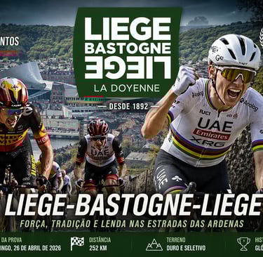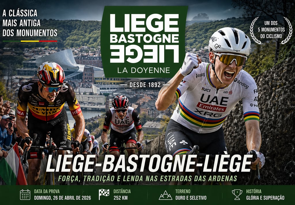 Tadej Pogačar (UAE Team Emirates-XRG) parte como favorito absoluto. Uma quarta vitória o deixaria empatado com Valverde e Argentin como segundo maior vencedor histórico da prova, atrás só de Merckx. A temporada 2026 é absurda: ganhou Strade Bianche, Milano-Sanremo e o Tour das Flandres. Poupou Amstel e Flèche Wallonne para descansar — exatamente o que fez antes de vencer em 2024 e 2025.